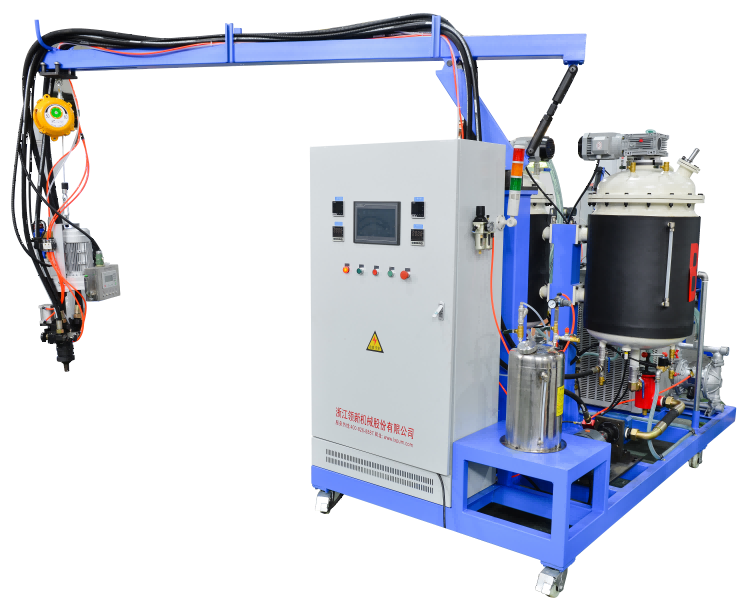 低壓發泡機是A料多元醇與B料異氰酸酯兩組原料分別儲存在兩個儲料罐中,通過兩臺高精度齒輪計量泵送至混合槍頭,經過攪拌葉高速攪拌而達到均勻的混合效果,注入模具中生產所需要的制品。
